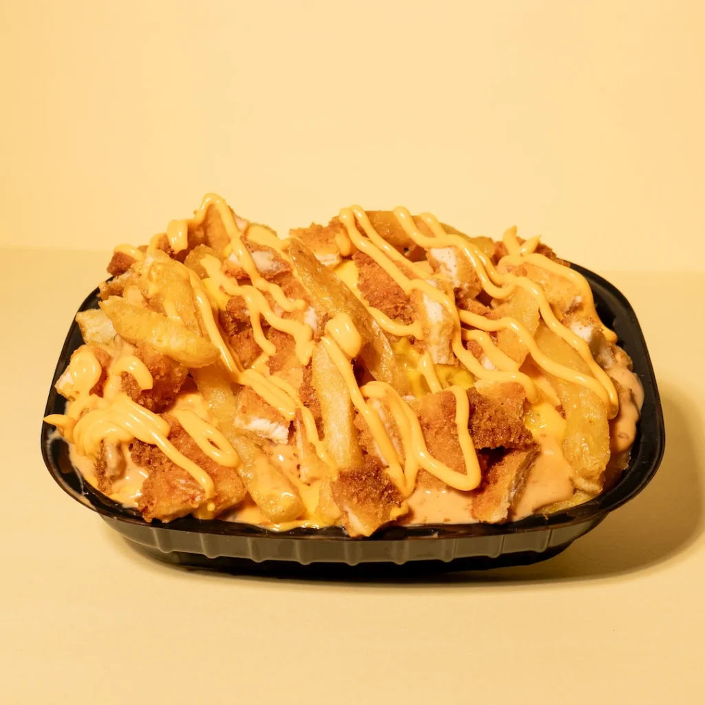 La especialidad, papas a la francesa caseras con trocitos de pollo frito, bañadas en queso americano, aderezo de pepino y queso para nachos.