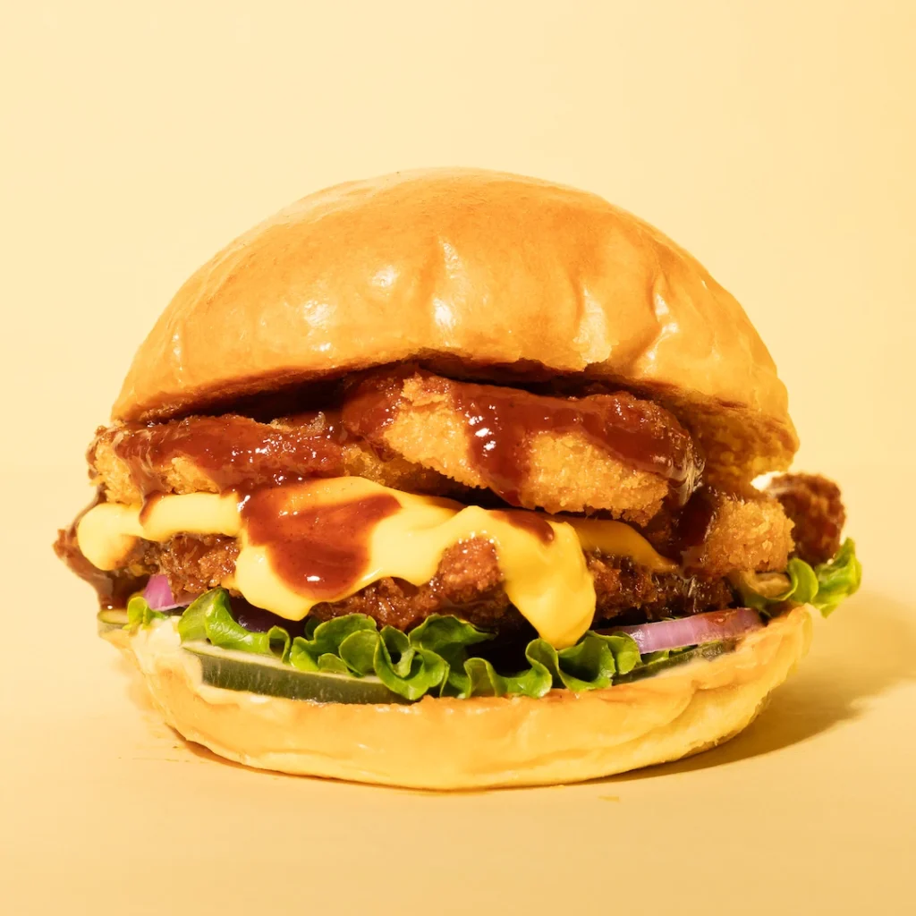 La favorita de muchos, chickan burger de pollo frito con bbq, queso americano, aros de cebolla doraditos, verdura y pepinillos.