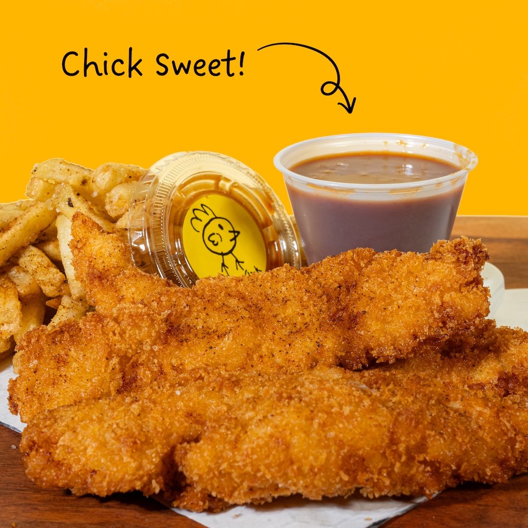 Orden llenadora de tres Mega Tiras de pollo cubiertas con nuestra crujiente receta secreta y con el aderezo especial Chick Sweet con notas de BBQ ahumado, un toque de especias aromáticas y un dulce secreto.